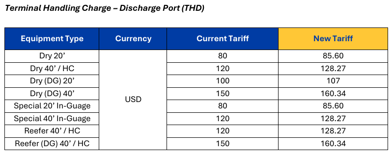 Please be informed of the upcoming change to the quantum of the Terminal Handling Charges (THD for discharge) in Jubail. The revised tariff will take effect on November 1st, 2025, based on the actual arrival date of the cargo.