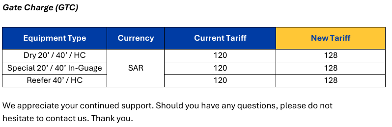 Please be informed of the upcoming change to the quantum of the Gate Charge (GTC) in Saudi Arabia. The revised tariff will take effect on November 1st, 2025, based on the actual arrival date of the cargo.