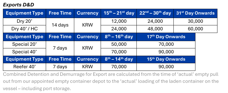Please be informed of the upcoming change to the quantum of the Combined Detention and Demurrage tariff for shipments from South Korea. The revised tariff will take effect on October 17th, 2025, based on the actual departure date of the cargo.