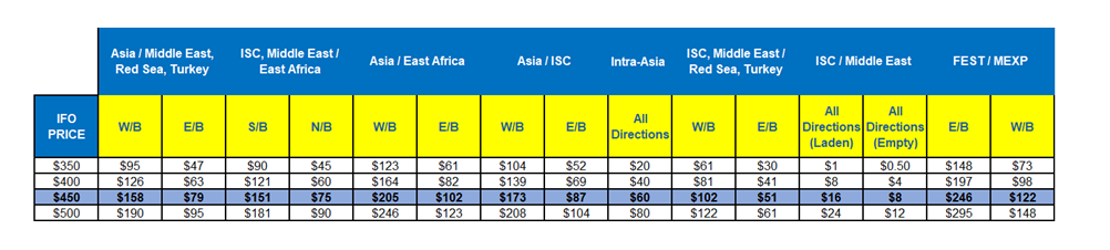 Please be informed that an Environmental Fuel Surcharge (EFS) as per below; will be imposed based on the Very Low Sulphur fuel price of between USD450 to USD500 per ton with effective from 1st Nov 2025.