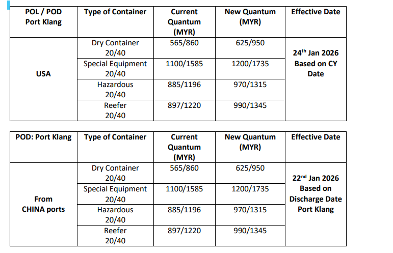 Please be informed that the Terminal Handling Charges at Port Klang for both Import and Export